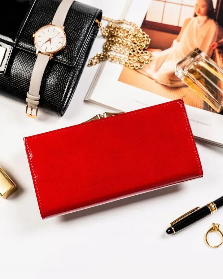 Środek portfela jest uszyty z czerwonej matowej skóry, natomiast na zewnątrz znajduje się lakierowana skóra saffiano. Model z maksymalnym poziomem funkcjonalności. Wyposażony w technologię RFID.