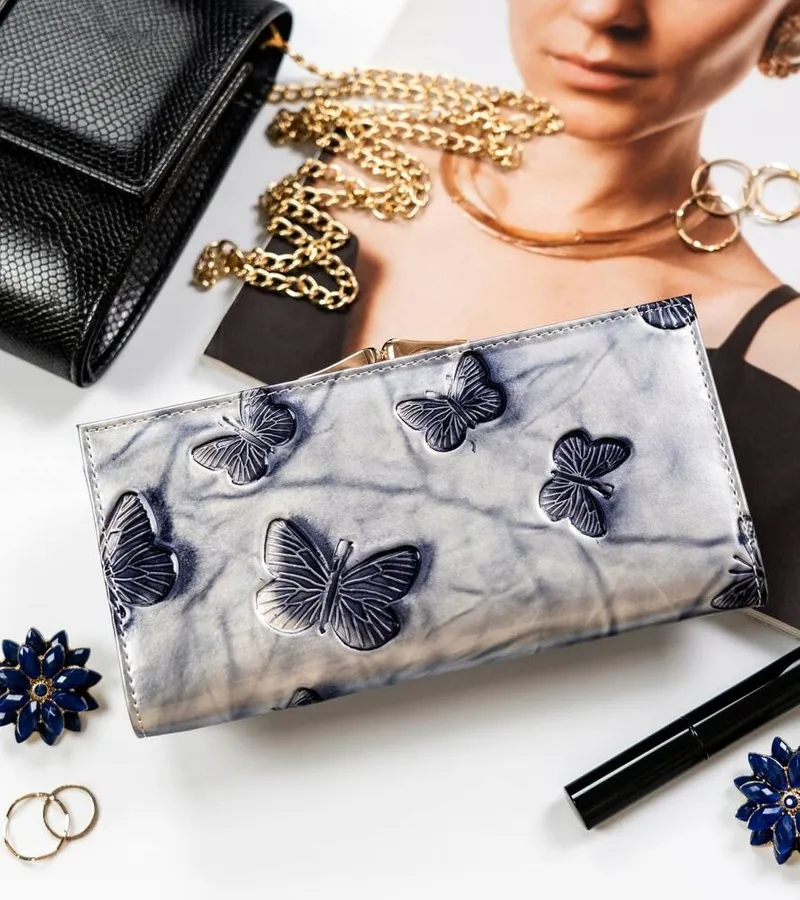Odszyty bardzo trwale z doskonałej jakości skóry naturalnej w srebrnym kolorze. Faktura ozdobiona tłoczeniem w motyle. Środek jest dobrze zorganizowany i posiada dużo miejsc na karty i dokumenty. Wyposażony w system RFID.