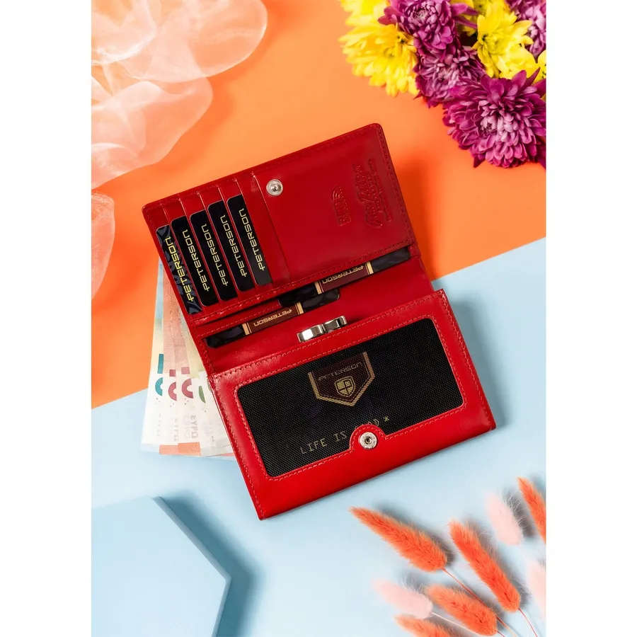 Elegancki czerwony portfel damski Peterson wykonany z naturalnej skóry. Posiada ochronę RFID, liczne przegródki na karty, banknoty i monety. Idealny wybór na każdą okazję. Styl i funkcjonalność w jednym!