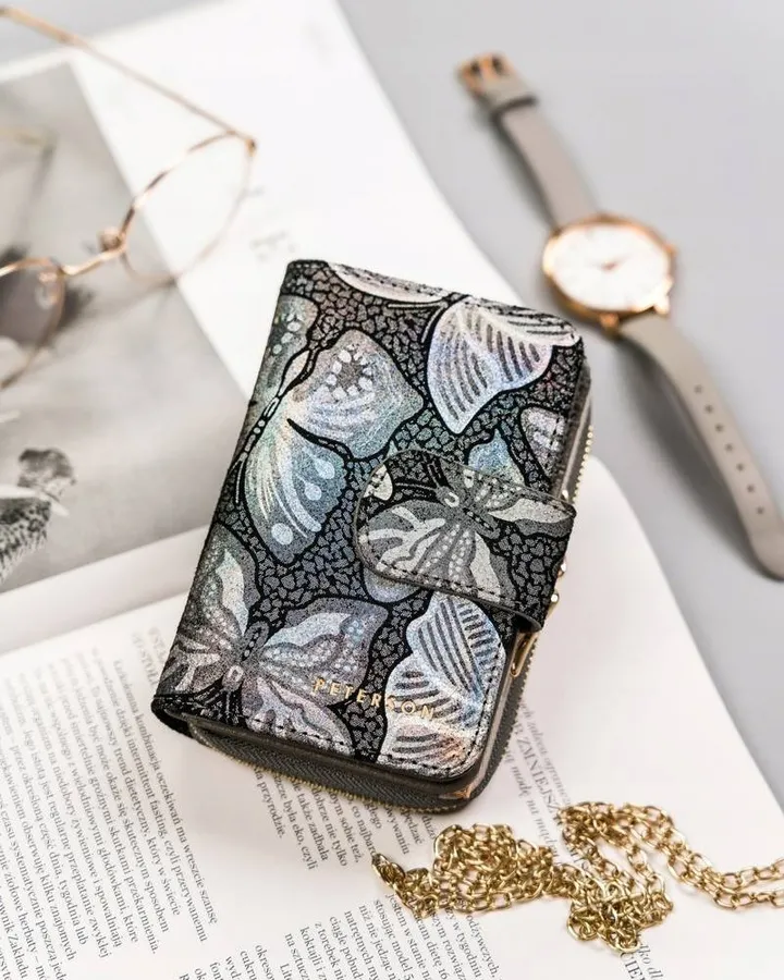 Odszyty ze skóry naturalnej, którego faktura zdobiona jest holograficznymi motylkami. Praktyczny i funkcjonalny. Środek dobrze zorganizowany, posiada dużo miejsc na karty i dokumenty. Portfel wyposażony w technologię RFID BLOCKING SYSTEM.