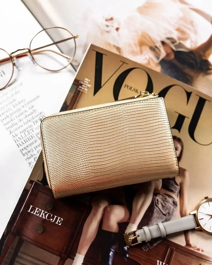 Poziomy portfel bez zewnętrznego zapięcia. Wykonany z gładkiej skóry naturalnej wysokiej jakości. Na froncie blaszka z logo marki. Portfel z kieszenią na dowód rejestracyjny. Dodatkowo posiada zabezpieczenie antykradzieżowe RFID Stop.