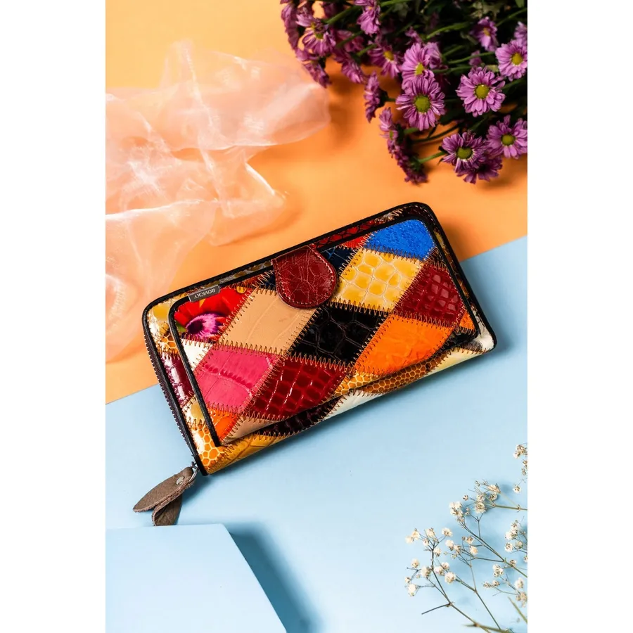 Portfel został wykonany z wysokogatunkowej skóry naturalnej. Zewnętrzną część portfela zdobi kolorowy patchworkowy wzór. Dzięki dużej ilości przegródek i kieszonek, w tym modelu schowasz wszystkie swoje karty, dokumenty, gotówkę i bilon.
