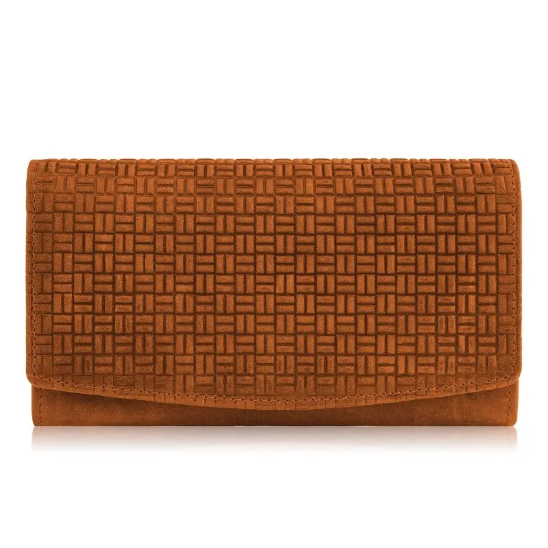 Duży portfel damski został wykonany z solidnej skóry naturalnej hunter, która cechuję się podwyższoną odpornością na użytkowanie. Na froncie portfela znajdują się oryginalne tłoczone wzory geometryczne, które dodają ciekawego charakteru całości. Portfel damski skórzany jest zapinany na solidny zatrzask, a dodatkowo kryje sporą ilość miejsca do przechowywania. Wyposażony jest w dwie przegrody na banknoty oraz jedną pojemna kieszeń na bilon, która jest zapinana na suwak. Wewnątrz portfela damskiego znajdziesz również, 6 przegród na karty kredytowe oraz dwa pojemne schowki na prywatne zapiski lub ważne paragony. Dodatkowo pod frontową klapą portfela umieściliśmy poziomo zapinaną obszerną kieszeń na twoje prywatne zapiski lub bilon. Mało miejsca? To nie wszystko! Z tyłu portfela znajduję się kolejny schowek oraz pojemna kieszeń zapinana na zamek błyskawiczny. W prezentowanym modelu umieściliśmy ochronną warstwę RFID, skutecznie blokującą przesył fal radiowych.