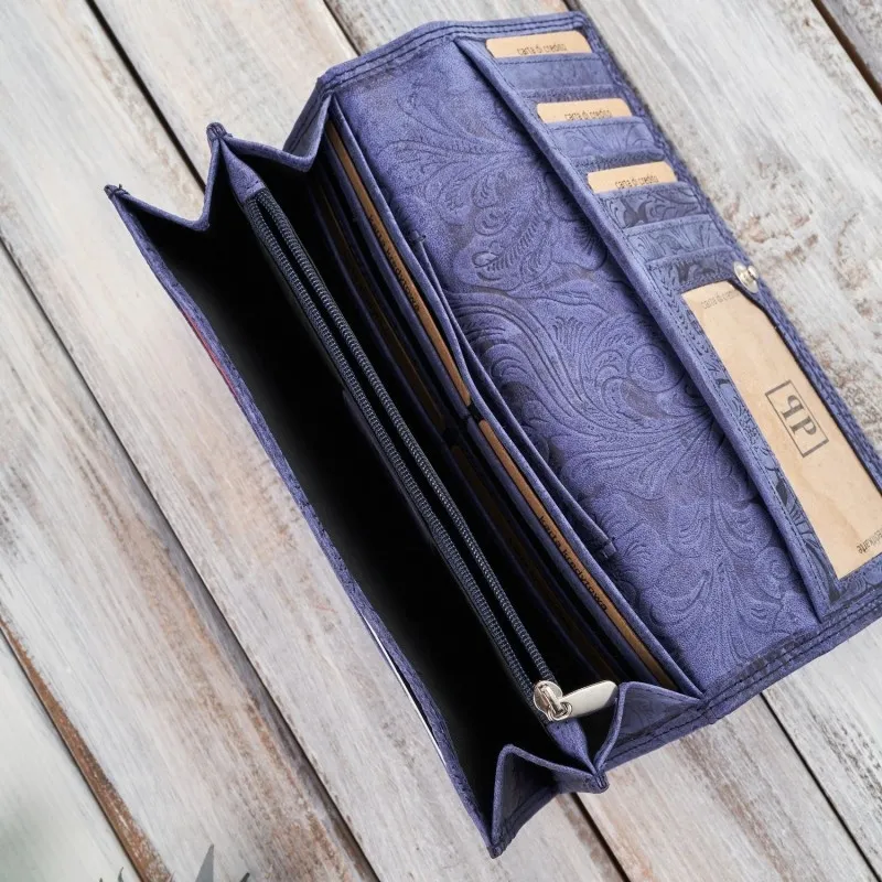 Duży portfel damski z postarzanej skóry naturalnej w kolorze czerwonym, orientacja pozioma. Wewnątrz dwie przegrody na banknoty, kieszeń na bilon oraz 20 przegródek na karty kredytowe. Dodatkowo kieszeń na suwak na tyle portfela i dwa schowki, w tym jeden transparentny. Wewnątrz warstwa ochronna RFID, zapobiegająca kradzieży danych. Idealny prezent dla kobiety w każdym wieku, która poszukuje pakownego portfela. CharakterystykaProducent: Paolo PeruzziModel: T-25-RDMateriał: skóra naturalna z efektem postarzeniaWzór: roślinny Kolor: czerwony Orientacja: poziomaIlość przegródek na karty: 20Ilość schowków: 2 (w tym jeden transparentny)Przegroda na banknoty: 2Kieszeń na bilon: tak, na suwakWarstwa ochronna RFID: takPudełko prezentowe: tak WymiaryWysokość: 10 cmSzerokość: 20 cmGrubość: ok. 3 cm
