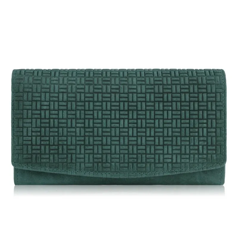 Duży portfel damski został wykonany z solidnej skóry naturalnej hunter, która cechuję się podwyższoną odpornością na użytkowanie. Na froncie portfela znajdują się oryginalne tłoczone wzory geometryczne, które dodają ciekawego charakteru całości. Portfel damski skórzany jest zapinany na solidny zatrzask, a dodatkowo kryje sporą ilość miejsca do przechowywania. Wyposażony jest w dwie przegrody na banknoty oraz jedną pojemna kieszeń na bilon, która jest zapinana na suwak. Wewnątrz portfela damskiego znajdziesz również, 6 przegród na karty kredytowe oraz dwa pojemne schowki na prywatne zapiski lub ważne paragony. Dodatkowo pod frontową klapą portfela umieściliśmy poziomo zapinaną obszerną kieszeń na twoje prywatne zapiski lub bilon. Mało miejsca? To nie wszystko! Z tyłu portfela znajduję się kolejny schowek oraz pojemna kieszeń zapinana na zamek błyskawiczny. W prezentowanym modelu umieściliśmy ochronną warstwę RFID, skutecznie blokującą przesył fal radiowych.