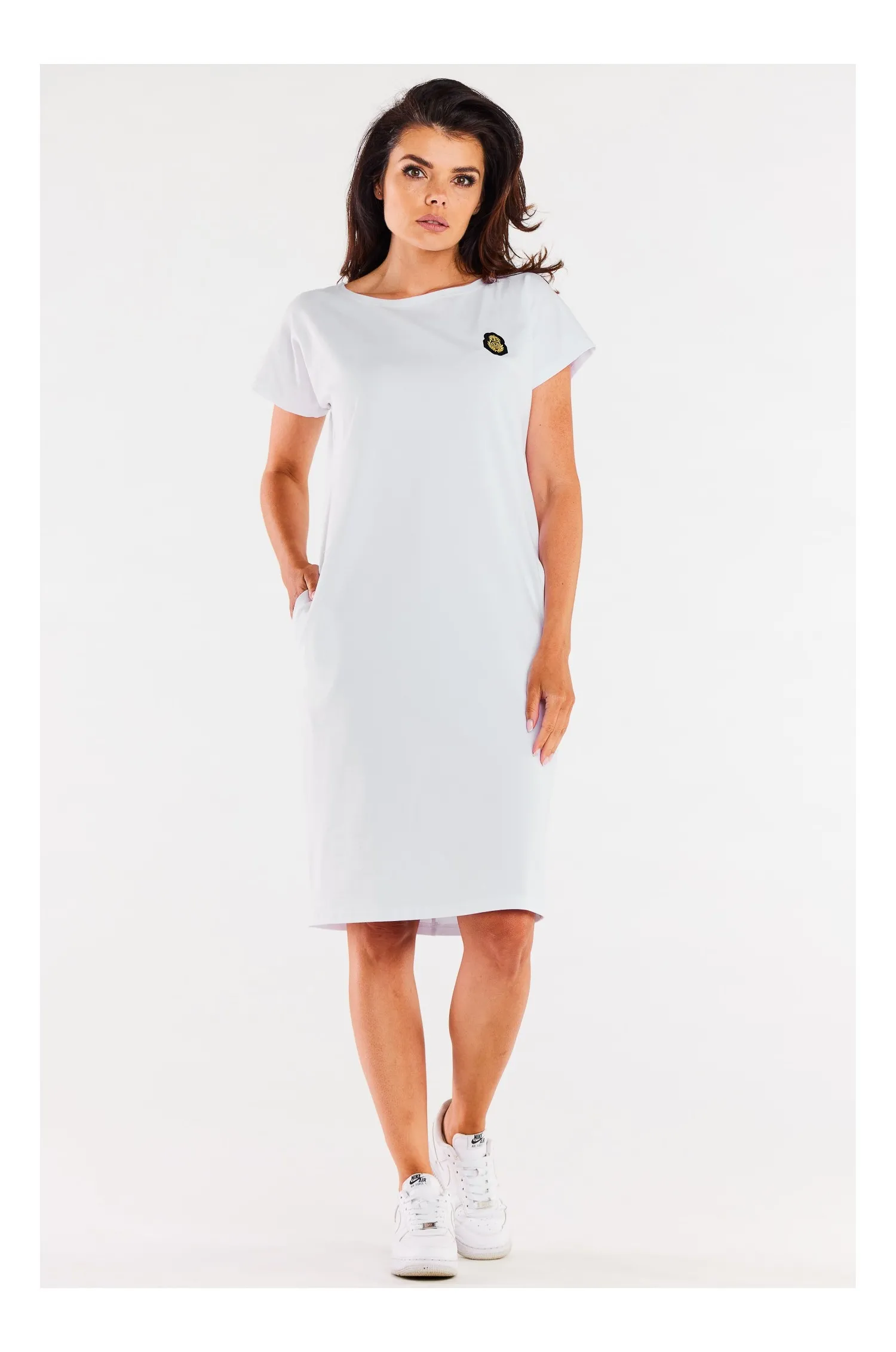 Biały prosta dzianinowa sukienka z aplikacją – to rewelacyjna towarzyszka ciepłych, wiosennych i letnich dni. Stworzyliśmy ją z miłej w dotyku i komfortowej w noszeniu dzianiny. Forma prosta, lekko zwężająca się ku dołowi, z krótkim rękawem typu kimono. Z przodu, dla ozdoby aplikacja w kontrastowym kolorze. Na wysokości bioder w szwach bocznych kieszenie. Poprzez swój fason i charakter daje szerokie spektrum zastosowania. Polecamy ją szczególnie stawiającym na luz i wygodę noszenia. Modelka ma 172 cm wzrostu i nosi rozmiar S Materiał: bawełna 95% elastan 5%