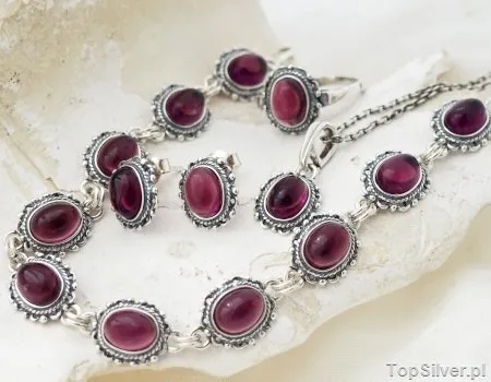 Wytworny zestaw srebrnej biżuterii, oksydowane elementy, w których niezwykle delikatny ażurowy wzór wkomponowano piękny krzemień pasiasty. Biżuteria wykonana została z dbałością o każdy szczegół. Wymiar pojedyńczego motywu zdobniczego: 10 x 12 mm Srebro: 925 W skład zestawu wchodzą: bransoletka, kolczyki, wisiorek oraz pierścionek. Kupując w komplecie oszczędzasz! Proszę mięć na uwadze fakt, iż krzemień pasiasty w tej biżuterii jest naturalny i nie ma możliwości aby kamienie były dokładnie takie same jak na fotografii.