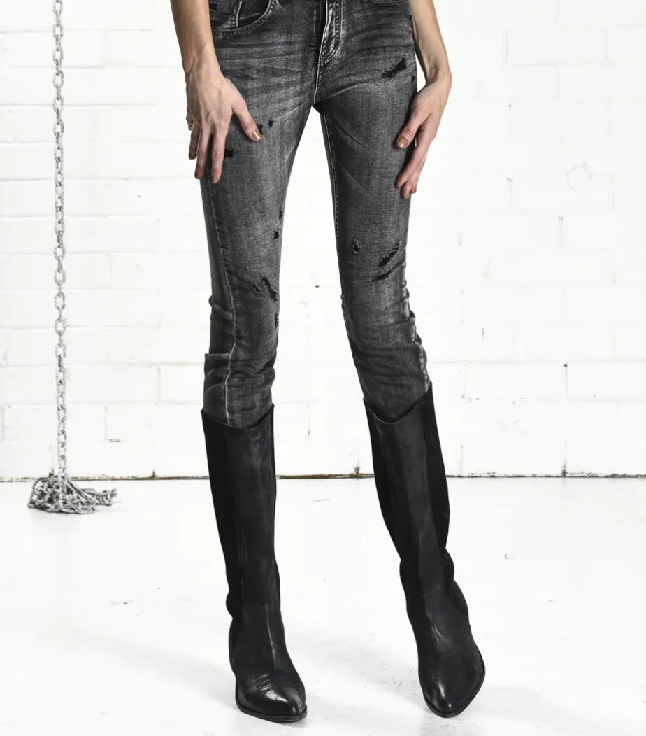 Nietuzinkowe jeansy Rossodisera typ boyfriend. Przód zdobiony charakterystycznymi dla marki naszywkami, metalowymi napami i przetarciami. Posiadają trzy przednie i dwie tylne kieszenie. Zapinane z przodu na guziki. Materiał: 99% cotton, 1% elastan