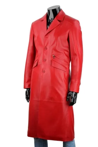ERKL467 - Długi płaszcz skórzany męski w kolorze szkarłatu DORJAN