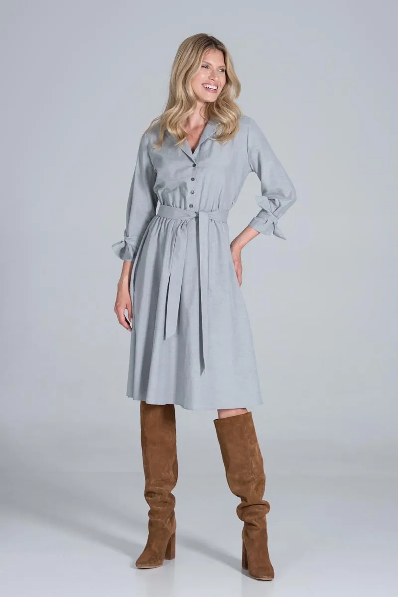 Rozkloszowana Sukienka na Guziki z Żakietowym Kołnierzykiem - Szara
