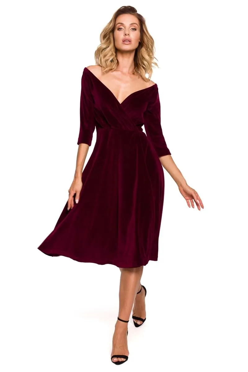 Rozkloszowana sukienka z weluru - bordowa - Rozmiar: L