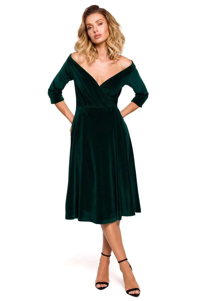 Rozkloszowana sukienka z weluru – zielona może zostać wybrana, jako kreacja zarówno na świąteczne spotkanie przy wigilijnym stole, jak i na imprezę sylwestrową. Materiał, z którego została ona wykonana, jest milutki i delikatnie mieniący. Dekolt z kopertowy założeniem optycznie wydłuża szyję i wysmukla sylwetkę. Na ramionach wstawki z gumy, dzięki czemu można nosić sukienkę z odkrytymi ramionami lub zmniejszyć dekolt. Odkryte ramiona dodają kreacji zmysłowej kobiecości. Jej krój i fason pięknie prezentują się na sylwetce, niezależnie od jej rodzaju. Błyszczące szpilki oraz welurowa torebka w tym samym kolorze będą wspaniałym dopełnieniem tej kreacji. Modelka ma 171 cm wzrostu i nosi rozmiar SMateriał: bawełna 80% poliester 20%