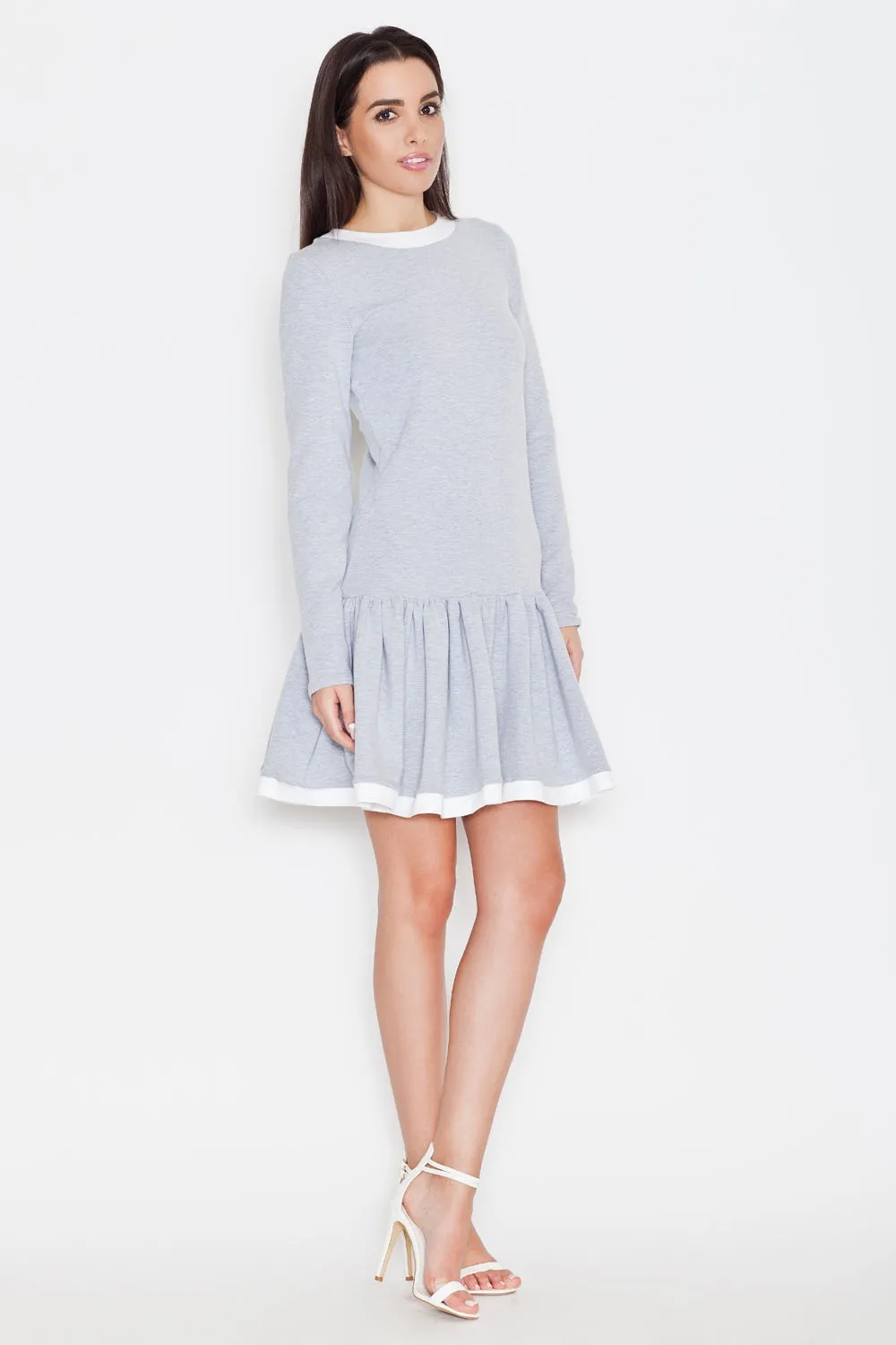 Różowa Codzienna Sukienka z Falbanką z Długim Rękawem