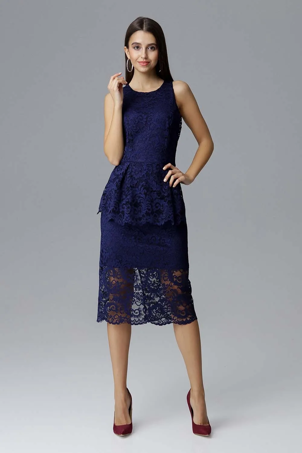 Granatowa Koronkowa Dopasowana Sukienka z Baskinką