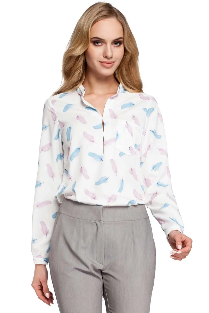 Wzorzysta Ecru Bluzka Koszulowa ze Stójką Model 1