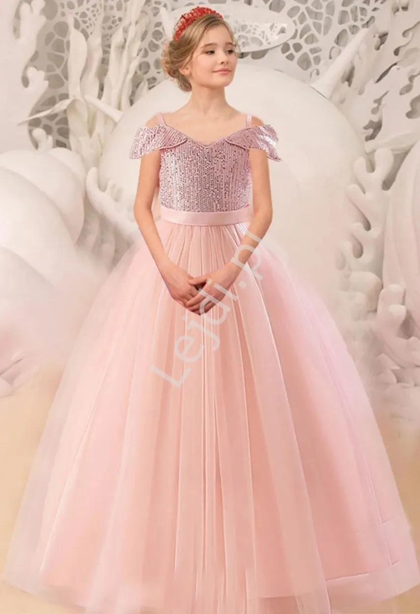 Różowa sukienka wieczorowa z cekinową górą, długa sukienka dla dziewczynki na wesele 0002