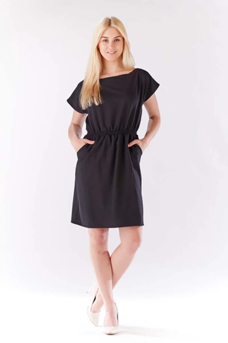 Czarna Sukienka z Gumkami w Talii z Kimonowym Rękawkiem
