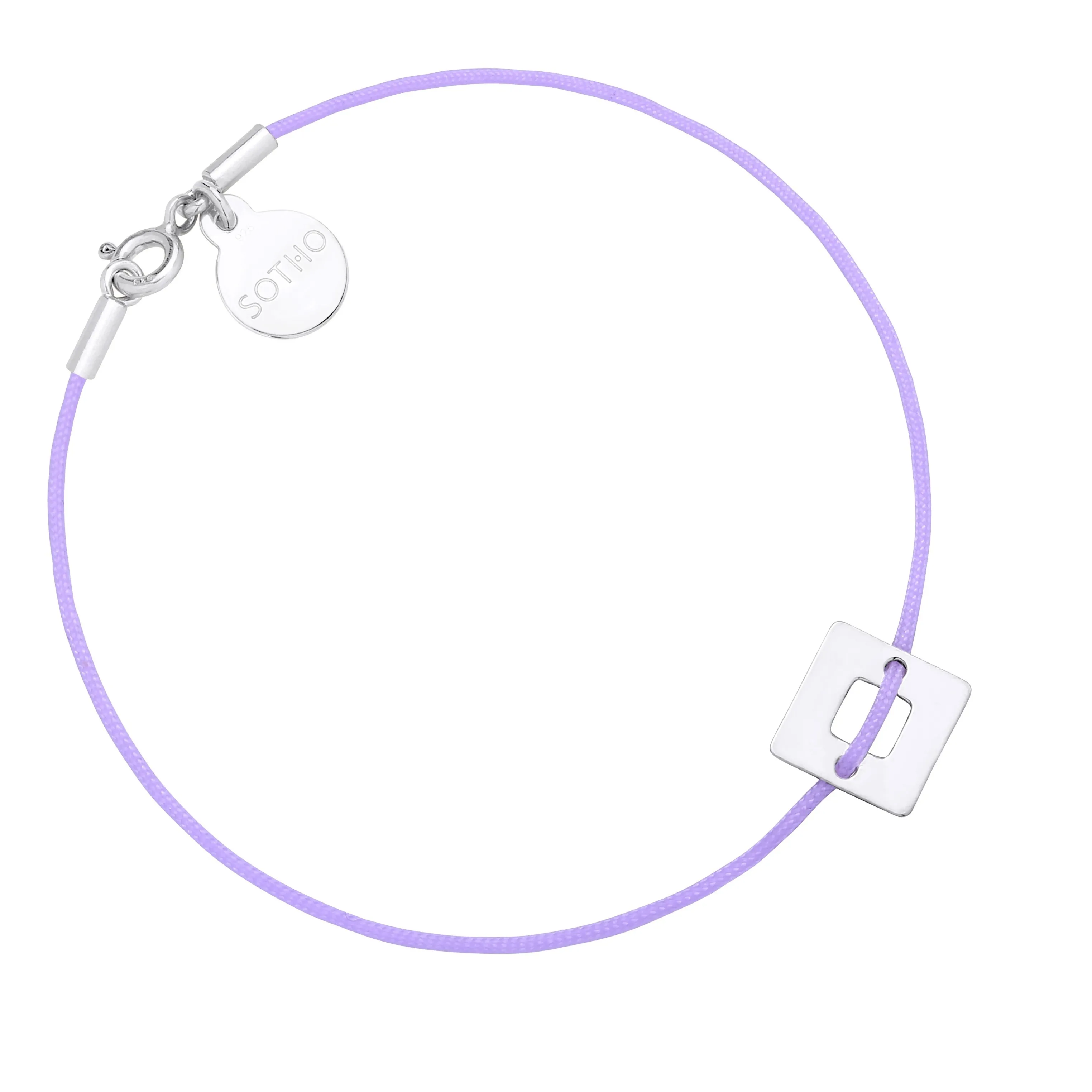 Liliowa sznurkowa bransoletka ze srebrnym kwadracikiem