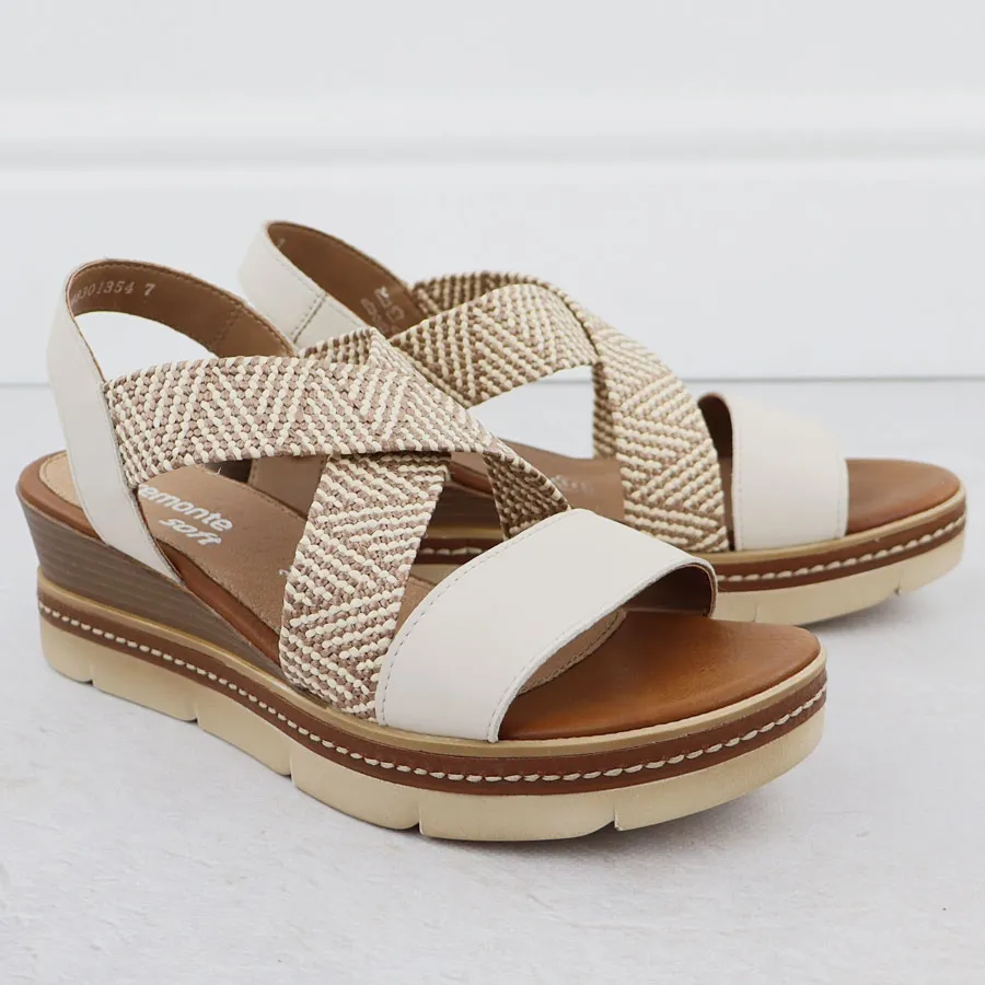 Skórzane sandały z gumkami wsuwane na koturnie beżowe Rieker Remonte D2L54-60