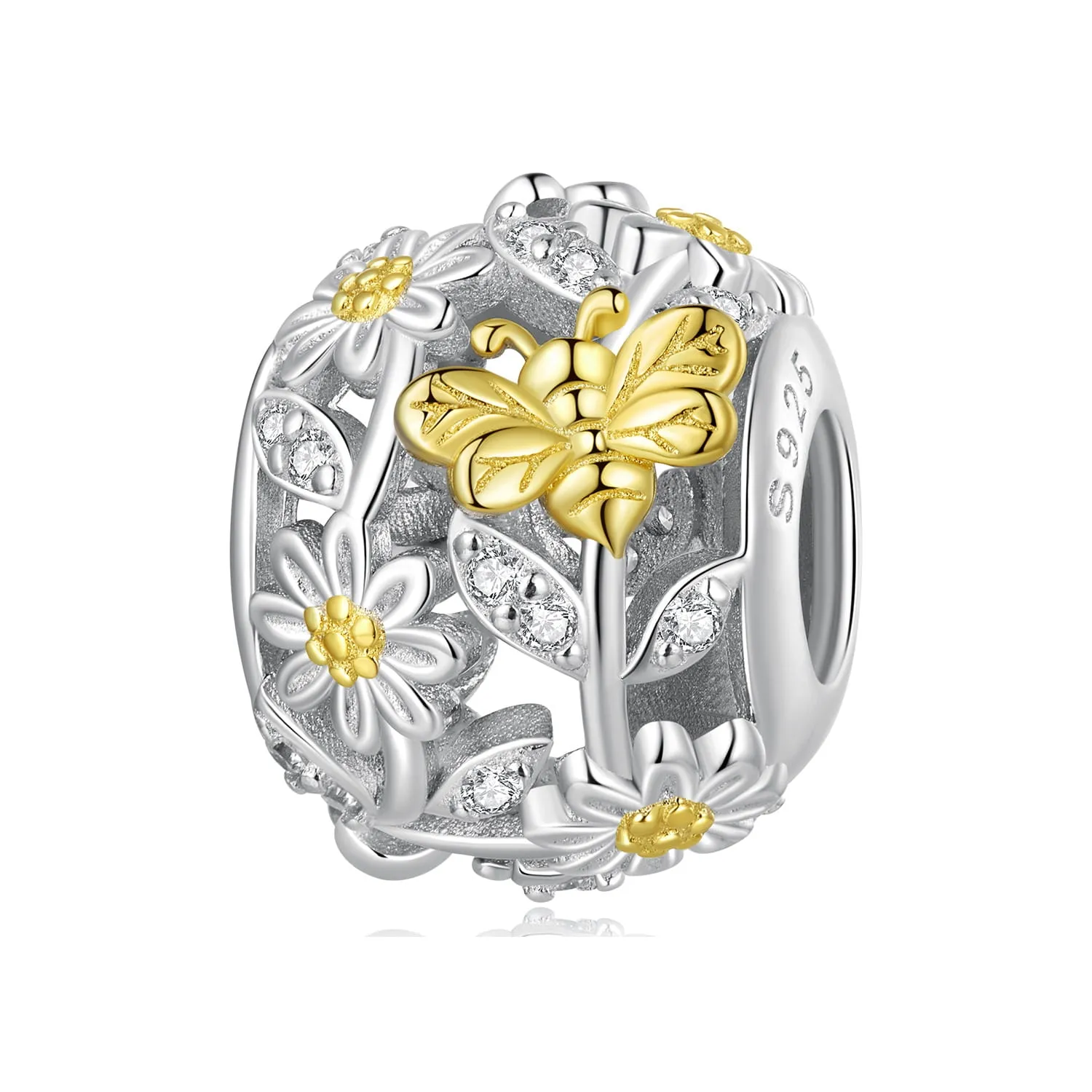 Kula z pozłacaną biedronką i kwiatami srebrny charms koralik beads