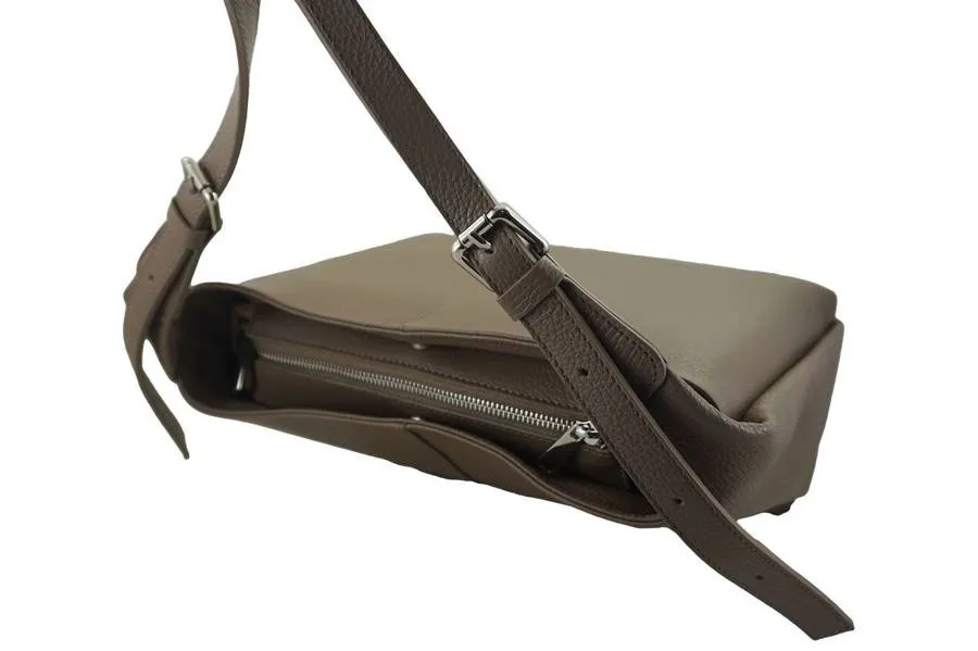 Wnętrze torebki: w komorze głównej, wykończonej podszewką, znajduje się mała zasuwana kieszonka oraz dwie kieszenie otwarte mieszczące telefon, portfel oraz klucze. Dodatkowo wyodrębniono dwie duże boczne wewnętrzne kieszenie zapinane na zatrzask. Klasyczna torebka skórzana na ramię jest zasuwana, posiada srebrne okucia, wygodnej długości uchwyt z czterostopniową regulacją (maksymalna dł. 80cm, maksymalna wys. 42cm), ozdobiony srebrnym klamrami. Torebka posiada pionowe przeszycie z obu stron, wyróżniające ten model. Klasyczna torebka skórzana na ramię dostępna w szerokiej gamie stonowanych kolorów.