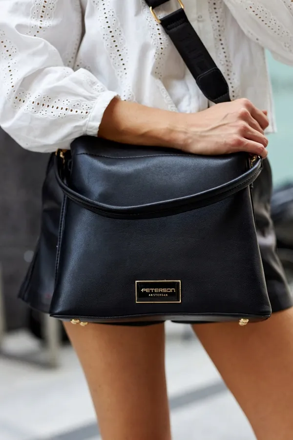Torba ze skóry ekologicznej. Środek wyściełano miękkim materiałem. Po bokach umieszczono zatrzaski, dzięki którym powiększysz lub pomniejszysz jej objętość. W środku wyszyto 2 kieszenie na suwak oraz dwie otwarte. Torebka na dwóch uchwytach.