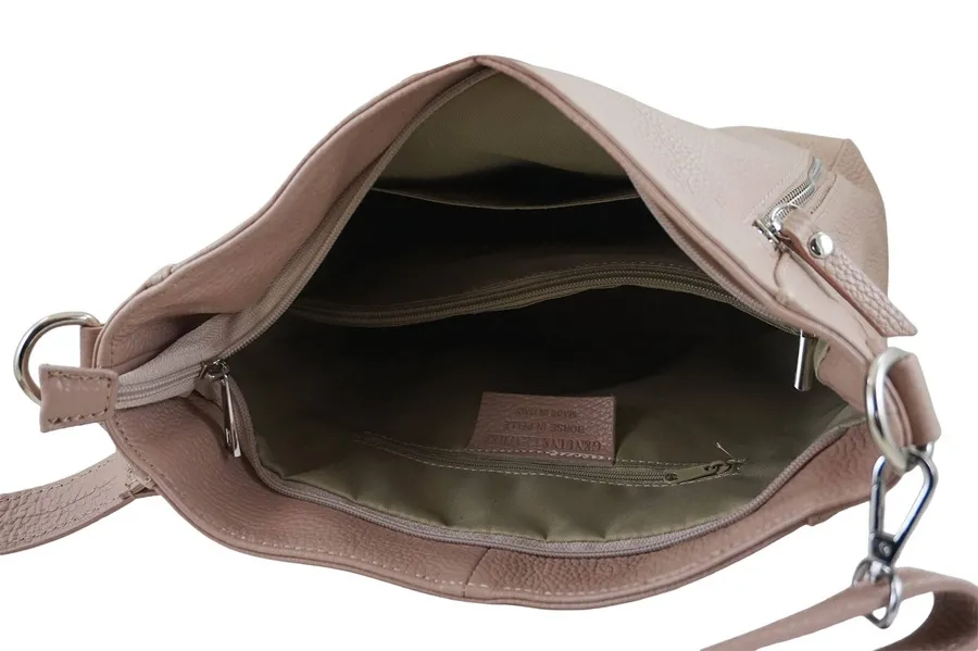 Praktyczna skórzana torebka na ramię w kolorze beżowym jest wykonana ze skóry naturalnej licowej. Szukasz wygodnej torebki mieszczącej niezbędne rzeczy do pracy, na uczelnię lub krótki wyjazd? Proponowaną w najnowszej kolekcji wygodnych i pojemnych torebek zaprojektowano tak, aby zmieściła dokumenty, notatki, portfel, telefon oraz kosmetyki. Poręczne wewnętrzne lub zewnętrzne kieszenie doskonale utrzymają porządek wewnątrz i z łatwością znajdziesz to czego szukasz – wszystko będzie na swoim miejscu. Praktyczna skórzana torebka na ramię na wygodnej długości regulowanym pasku to propozycja dla Pań ceniących gustowne dodatki codziennej swobodnej garderoby. Gwarantujemy zadowolenie z zakupionych produktów – najnowsze trendy, stonowane kolory oraz subtelne ozdoby przemawiają za wyborem torebki oraz portfela w naszym sklepie. Wnętrze torebki: praktyczna torebka skórzana na ramię jest wykończona podszewką.