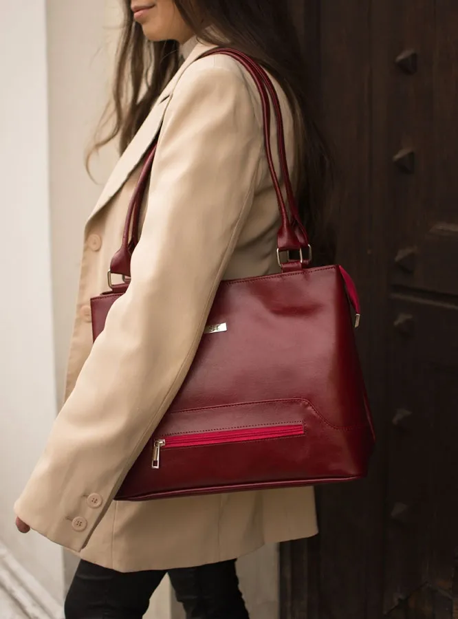 Shopperka skórzana polskiej marki DAN-A. Wnętrze skrywa dwie komory oraz dwie boczne kieszonki – na zamek i telefon. Wymiary: wysokość – 27 cm szerokość – 31 cm głębokość – 10 cm długość paska – max 140 cm długość rączek – 62 cm