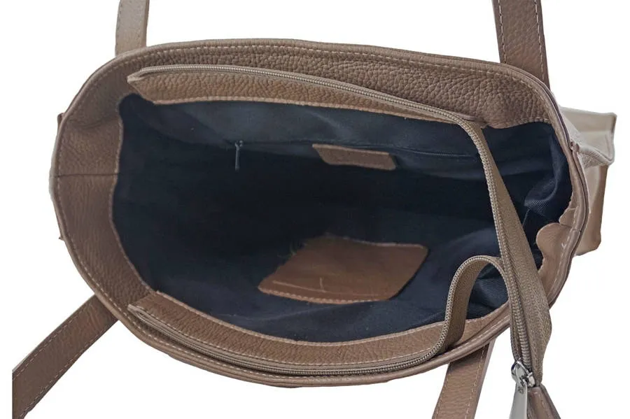 Wnętrze torebki: przestronne wnętrze jest wykończone podszewką. Wewnątrz wyodrębniono małą zasuwaną kieszonkę mieszczącą drobne kosmetyki oraz miejsce na telefon. Torebka skórzana na ramię mieści format A4, jest zasuwana, posiada uchwyty bez regulacji ozdobione srebrnymi nitami (długość 60cm, wysokość 26cm), pojemną kieszeń z przodu oraz zasuwaną kieszonkę z tyłu, umożliwiającą szybki dostęp np. do kluczy. Codzienna torebka skórzana na ramię dostępna w szerokiej palecie kolorów.