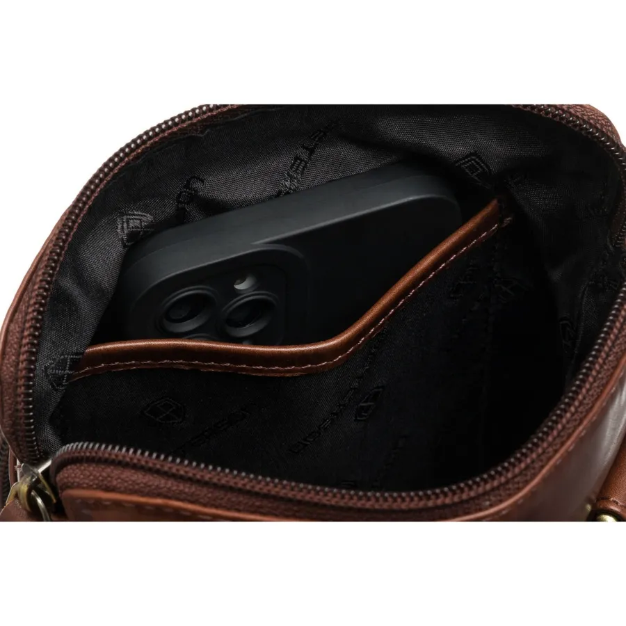 Brązowa listonoszka męska wykonana ze skóry naturalnej. Mała, ale pojemna – ma jedną komorę i 5 praktycznych kieszeni. Zawieszona na wygodnym, regulowanym pasku i zamykana suwakiem oraz klipsem magnetycznym.