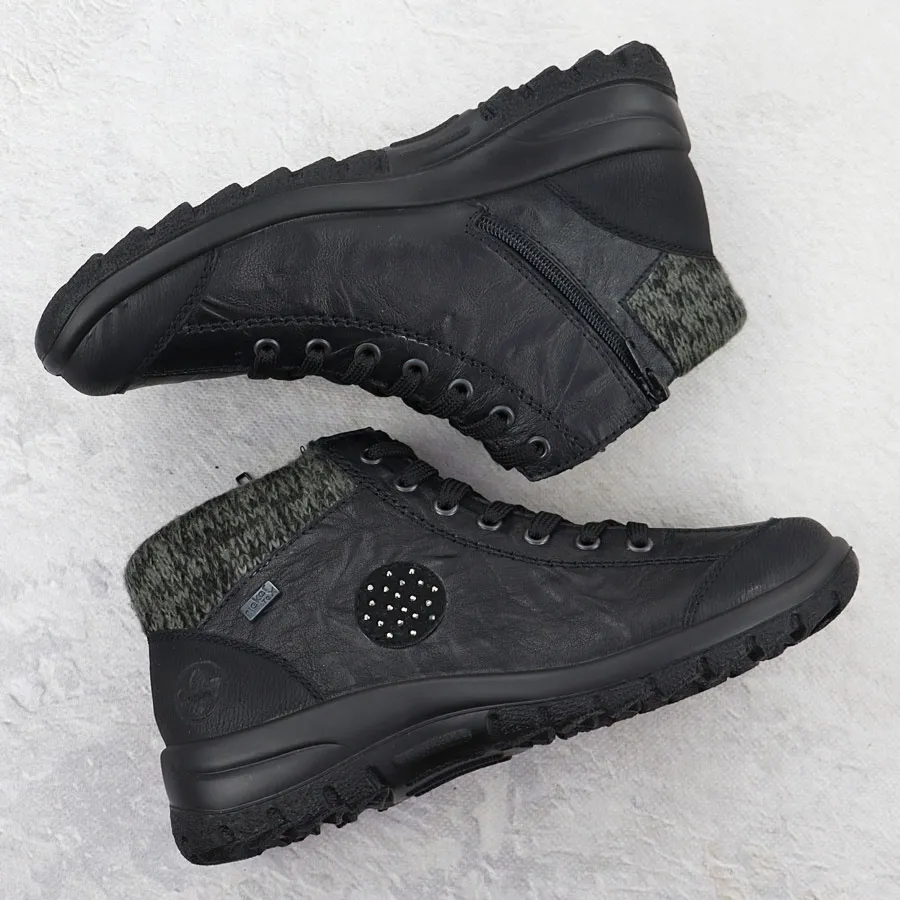 Skórzane wodoodporne botki damskie ocieplane czarne Rieker L7110-01