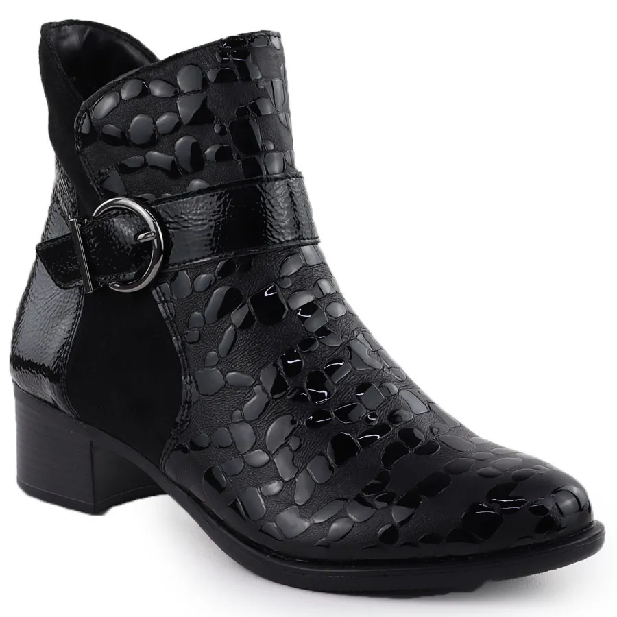 Skórzane botki damskie na obcasie lakierowane czarne Remonte Rieker R5188-02