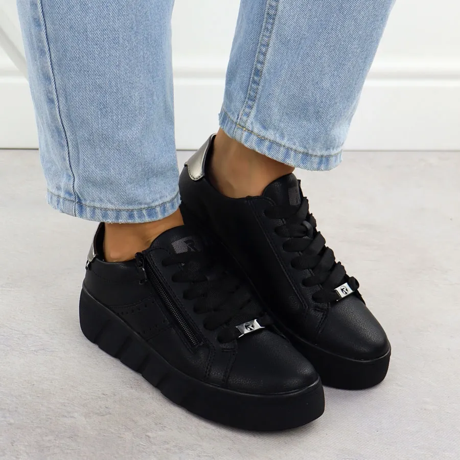 Skórzane półbuty damskie na platformie czarne Rieker W2605-02