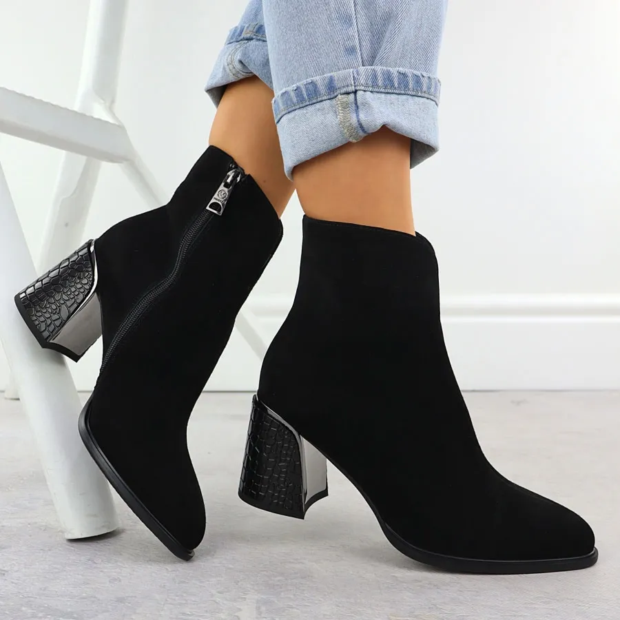 Skórzane botki damskie na ozdobnym obcasie czarne Vinceza 66801