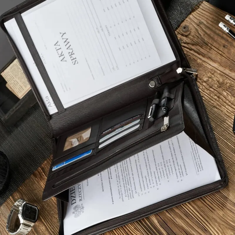 Biwuar został wykonany z postarzanej skóry naturalnej hunter, która patynuje się i nabiera indywidualnego charakteru wraz z intensywnością użytkowania. Zapinany na suwak błyskawiczny, pomieści dokumenty w formacie A4. Wewnątrz do dyspozycji jest 5 przegródek na karty kredytowe, 2 miejsca na długopisy oraz elastyczne mocowanie na dokumenty. Ponadto, w biwuarze umieszczono dużą kieszeń wsuwaną oraz kieszonkę na suwak po długości. Na tyle znajduje się kolejna kieszeń po długości, w której zmieszczą się notatki i zapiski. Biwuar świetnie sprawdzi się jako akcesorium do pracy biurowej czy podczas spotkań z klientami.