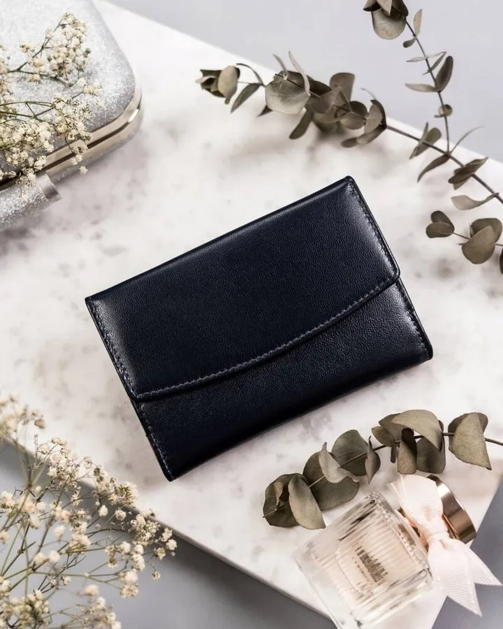 Mały, elegancki portfel damski ze skóry naturalnej w klasycznym odcieniu. Zamykany patką z mocnym zatrzaskiem. Wewnątrz praktyczny segregator na karty i dokumenty, które zabezpiecza antyskimmingowa membrana. Akcesorium zapakowane w markowe pudełko.