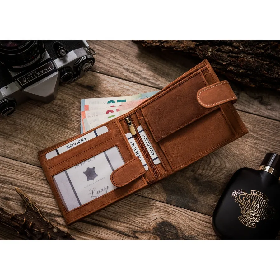 Portfel odszyty z trwałej nubukowej skóry naturalnej w brązowym kolorze. Portfel w orientacji poziomej, zapinany na zatrzask. Posiada rozbudowane wnętrze – mieści dowód rejestracyjny. Wyposażony w system RFID.