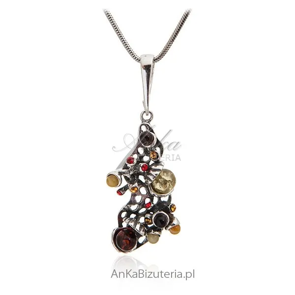 Piękna zawieszka srebrna z bursztynem i kryształkami swarovski