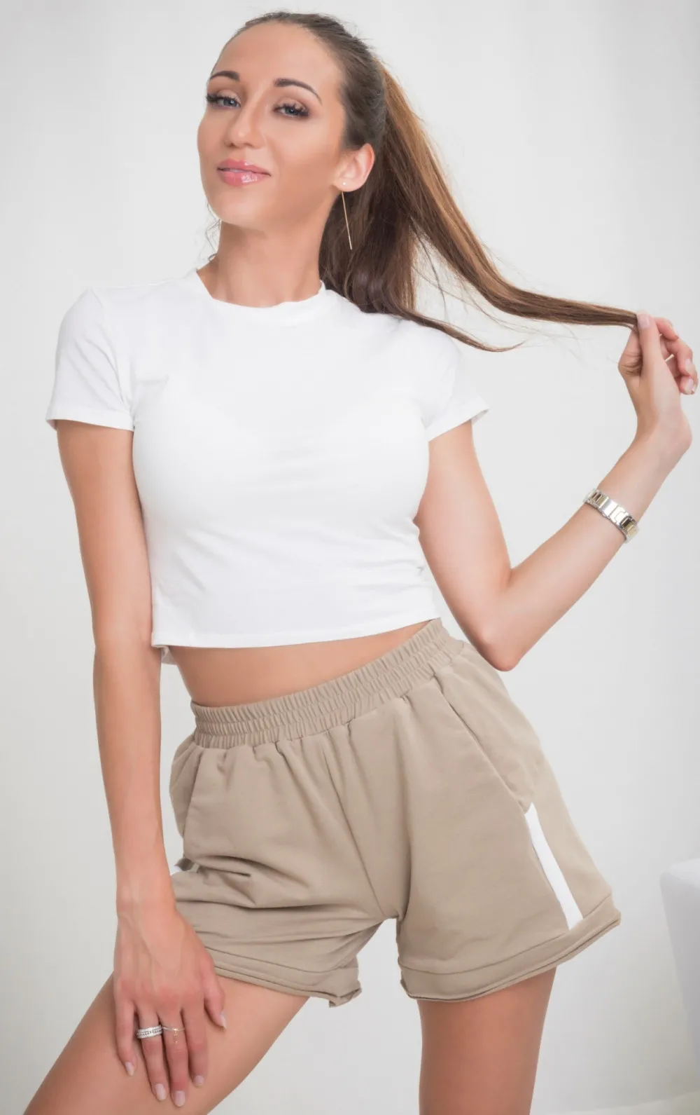 Beżowe spodenki z białymi elementami. Przypadną do gustu miłośniczkom sportowych klimatów. Szorty zostały zaprojektowane tak, żeby mogły dopasować się do Twojej figury i podkreślić jej atuty. Naszym zdaniem dobrym pomysłem będzie zestawienie ich z kolorową, wzorzystą bluzką i butami na wyższej podeszwie. skład: 92% cotton, 8% elastan WYMIARY SPODENEK XS/S M/L XL/XXL 1/2 TALIA 44 48 52 1/2 TALIA GUMA 31 35 39 1/2 BIODRA 50 54 58 1/2 DÓŁ 28 32 36 DŁUGOŚĆ 36 36,5 37 WYMIARY CIAŁA XS S M L XL XXL BIUST 82-85 86-89 90-93 94-97 98-101 102-105 TALIA 66-69 70-73 74-77 78-81 82-85 86-89 BIODRA 92-95 96-99 100-103 104-107 108-111 112-115