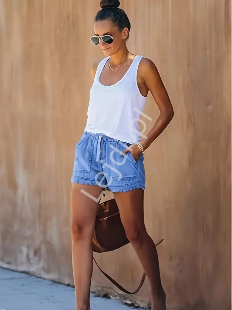 Jeansowe krótkie spodenki ze strzępionymi nogawkami. Spodenki w kolorze białym.