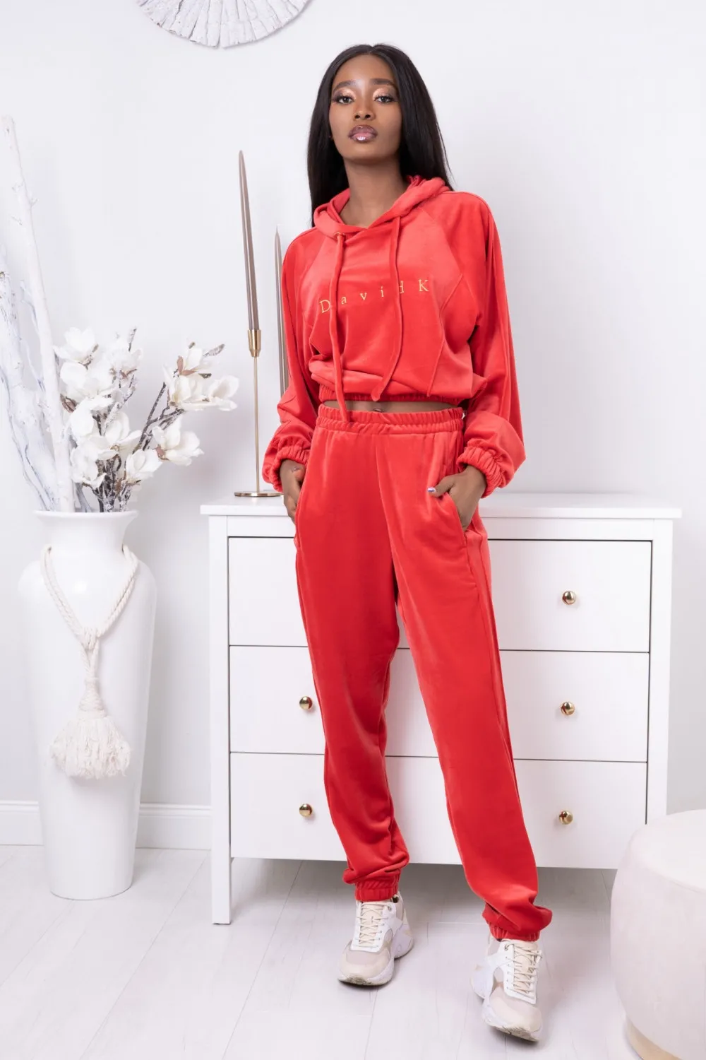 Welurowe spodnie dresowe w kolorze czerwonym. Zostały wykonane z niezwykle efektownego, odbijającego światło materiału, który jest też przyjazny dla skóry i bardzo trwały. Ten model zapewni Ci wygodę noszenia, głównie dzięki luźnemu fasonowi i elastycznej gumce. Wykorzystaj spodnie jako część streetwearowego looku, łącząc je z krótką bluzą i botkami. WYMIARY ODZIEŻY XS/S M/L XL/XXL 1/2 PAS 31 35 39 1/2 BIODER 50 54 58 DŁUGOŚĆ 103 103.5 104 WYMIARY CIAŁA XS S M L XL XXL BIUST 82-85 86-89 90-93 94-97 98-102 103-107 TALIA 66-69 70-73 74-77 78-81 82-85 86-90 BIODRA 92-95 96-98 99-101 102-104 105–108 109-112