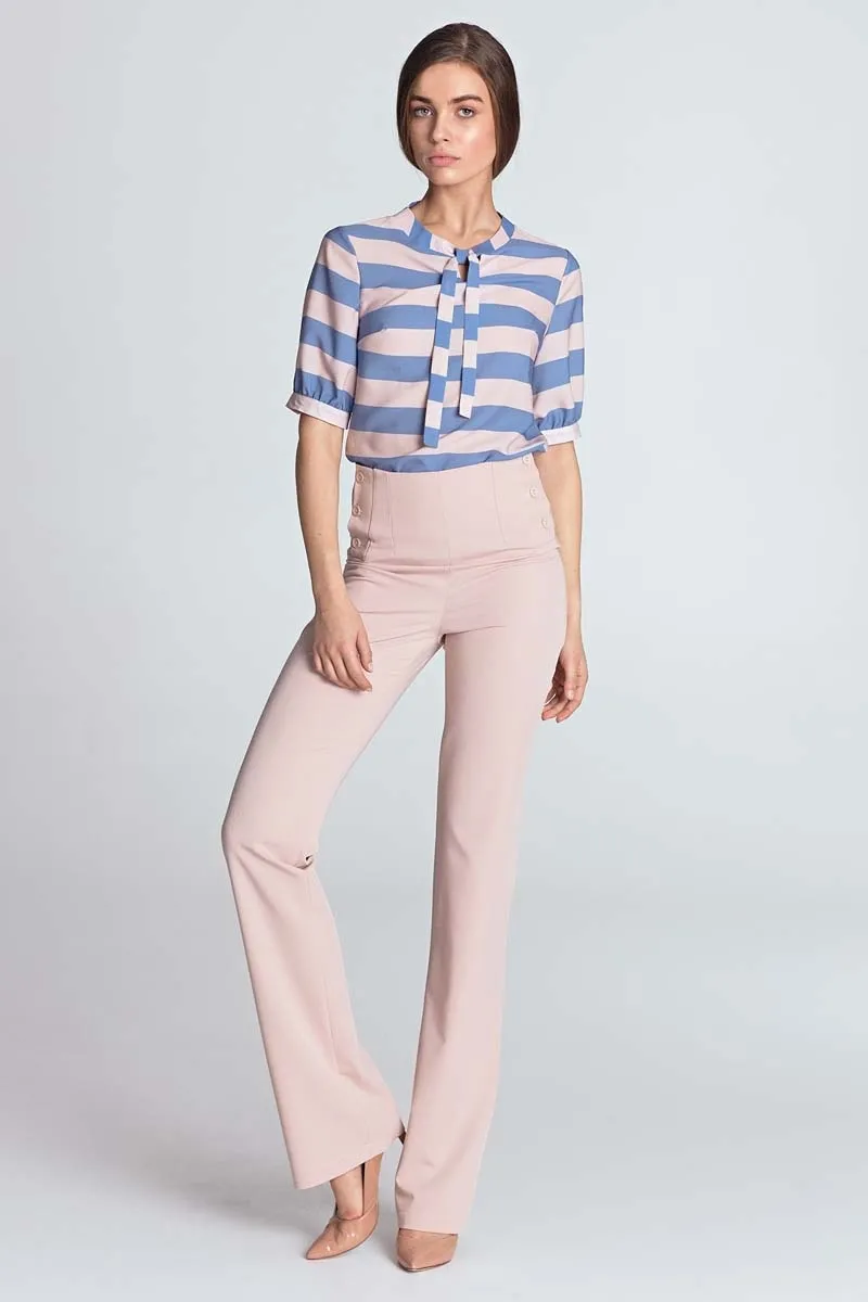 Niebieskie spodnie z podwyższoną talią zdobioną guzikami sprawdzą się zawsze wtedy, gdy nie wiesz, co na siebie włożyć. Dobrze komponują się zarówno z elegancką koszulą, jak i z grubym, dzianinowym swetrem. Spodnie z wysokim stanem o zwężanych nogawkach to komfortowy wybór, nieograniczający swobody ruchów. Mają praktyczne kieszenie po bokach z ozdobnymi guzikami dodającymi modowego szyku. W tych spodniach z wysokim stanem bez wątpienia będziesz wyglądać i czuć się jak prawdziwa kobieta.Materiał: 100% poliester