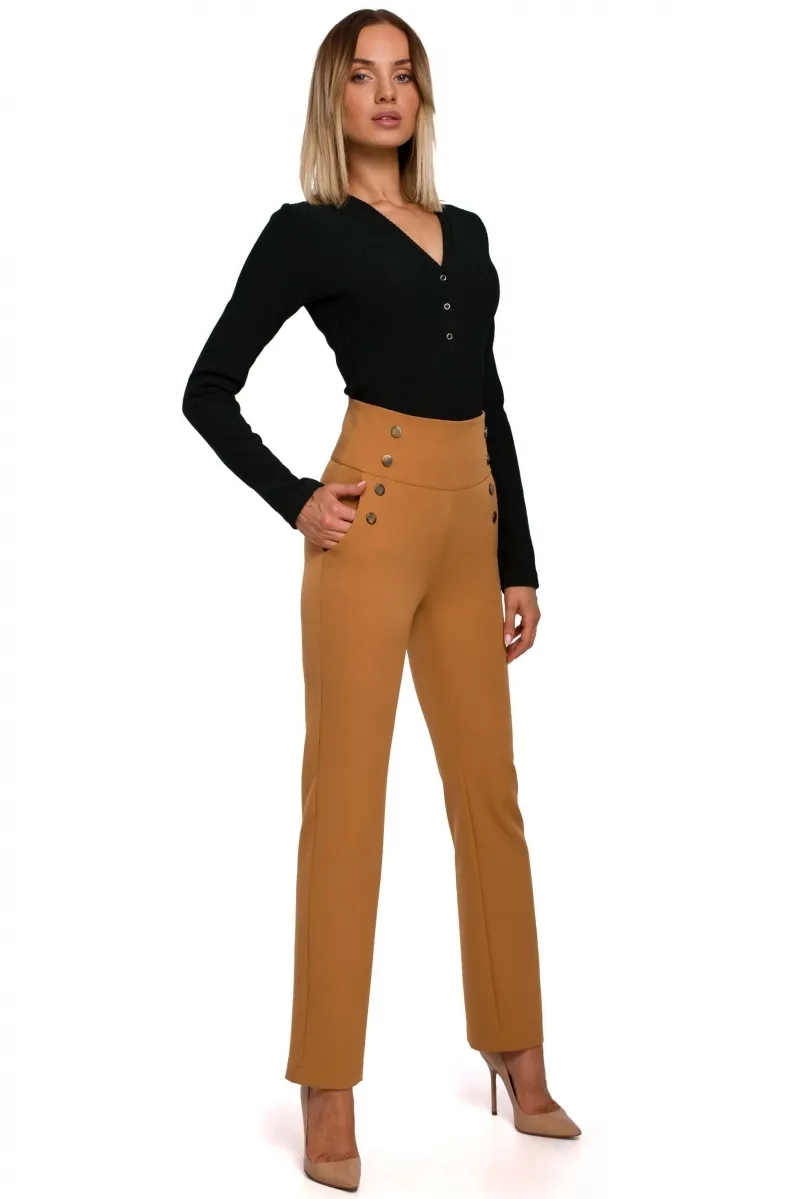 Brązowe spodnie z wysokim stanem zdobione napami to modny akcent do Twojej wiosennej garderoby. Pięknie prezentują się w towarzystwie klasyków takich jak czarny golf, ale też trendowych elementów, na przykład obszernego swetra. Mają prosty, delikatnie dopasowany krój z bardzo wysokim stanem. Spodnie mają praktyczne kieszenie po bokach , a z przodu ozdobione są metalowymi napami. Spodnie z napami podkreślą każdą stylizację, zarówno tą mniej, jak i bardziej elegancką. Z powodzeniem zastąpią spódnicę, mogą też być zamiennikiem klasycznych jeansów noszonych na co dzień. Modelka ma 171 cm wzrostu i nosi rozmiar S Materiał: poliester 95% elastan 5%