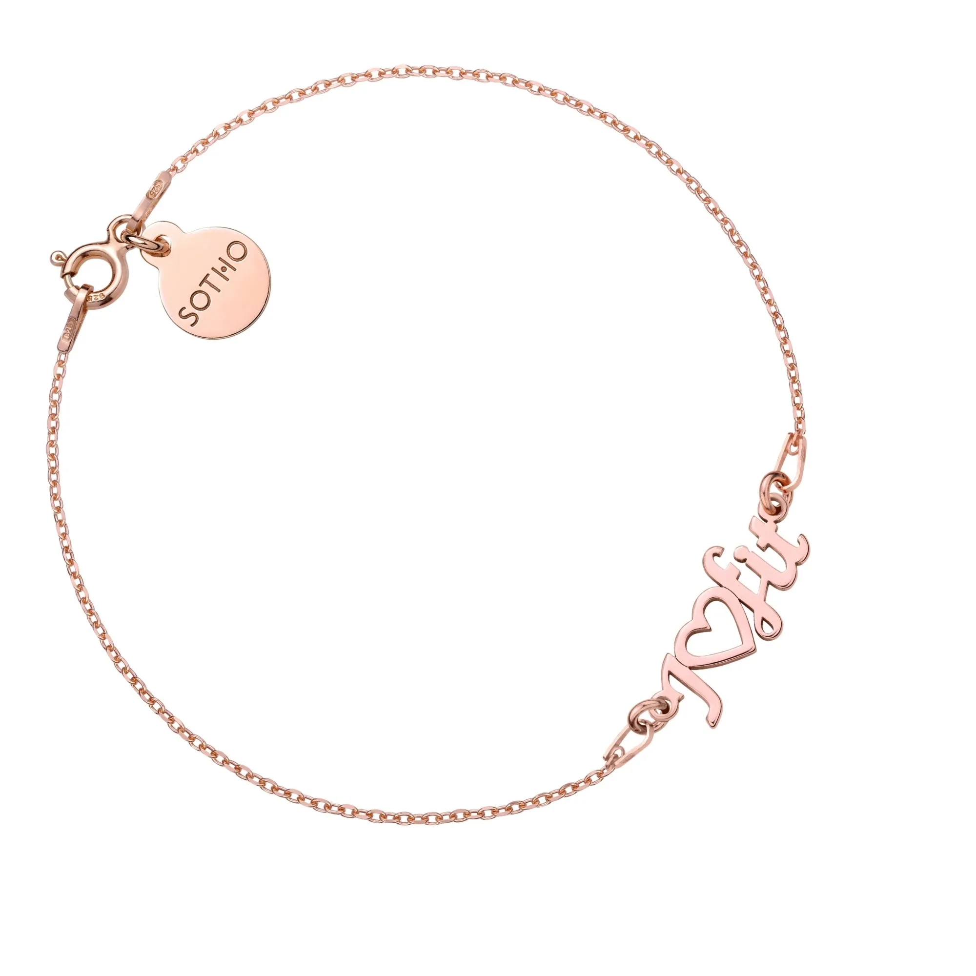 Srebrna bransoletka łańcuszkowa zdobiona napisem I Love Fit i zawieszką z logo marki. Całość wykonana ze srebra 925. Długość bransoletki ok 17,8 cm. Grubość łańcuszka 1 mm. Napis 20 x 9 mm. Zawieszka z logo 10 mm. Produkt o wadze poniżej 5 g. Zapakowana w eleganckie pudełeczko z logo marki. Posiada logowaną metkę. Istnieje możliwość zamówienia bransoletki innej długości, z innym modelem zawieszki, z kilkoma zawieszkami, na innym modelu łańcuszka, w wersji ze srebra 925 powlekanego 24 karatowym żółtym lub różowym złotem, z dodatkowymi kamieniami, perłami lub kryształami SWAROVSKI® CRYSTAL itp.