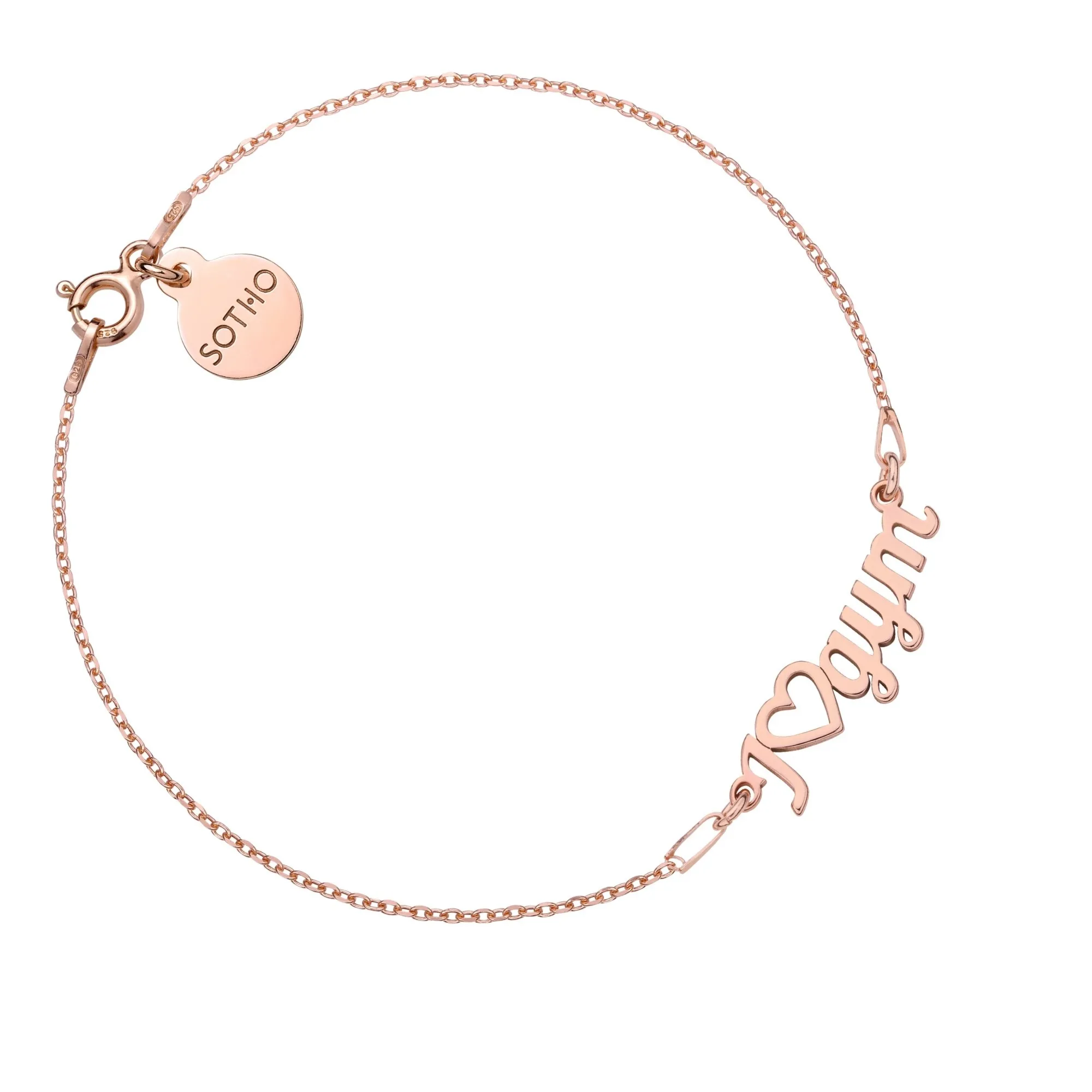 Srebrna bransoletka łańcuszkowa zdobiona napisem I Love Gym i zawieszką z logo marki. Całość wykonana ze srebra 925. Długość bransoletki ok 17,8 cm. Grubość łańcuszka 1 mm. Napis 20 x 9 mm. Zawieszka z logo 10 mm. Produkt o wadze poniżej 5 g. Zapakowana w eleganckie pudełeczko z logo marki. Posiada logowaną metkę. Istnieje możliwość zamówienia bransoletki innej długości, z innym modelem zawieszki, z kilkoma zawieszkami, na innym modelu łańcuszka, w wersji ze srebra 925 powlekanego 24 karatowym żółtym różowym złotem, z dodatkowymi kamieniami, perłami lub kryształami SWAROVSKI® CRYSTAL itp.