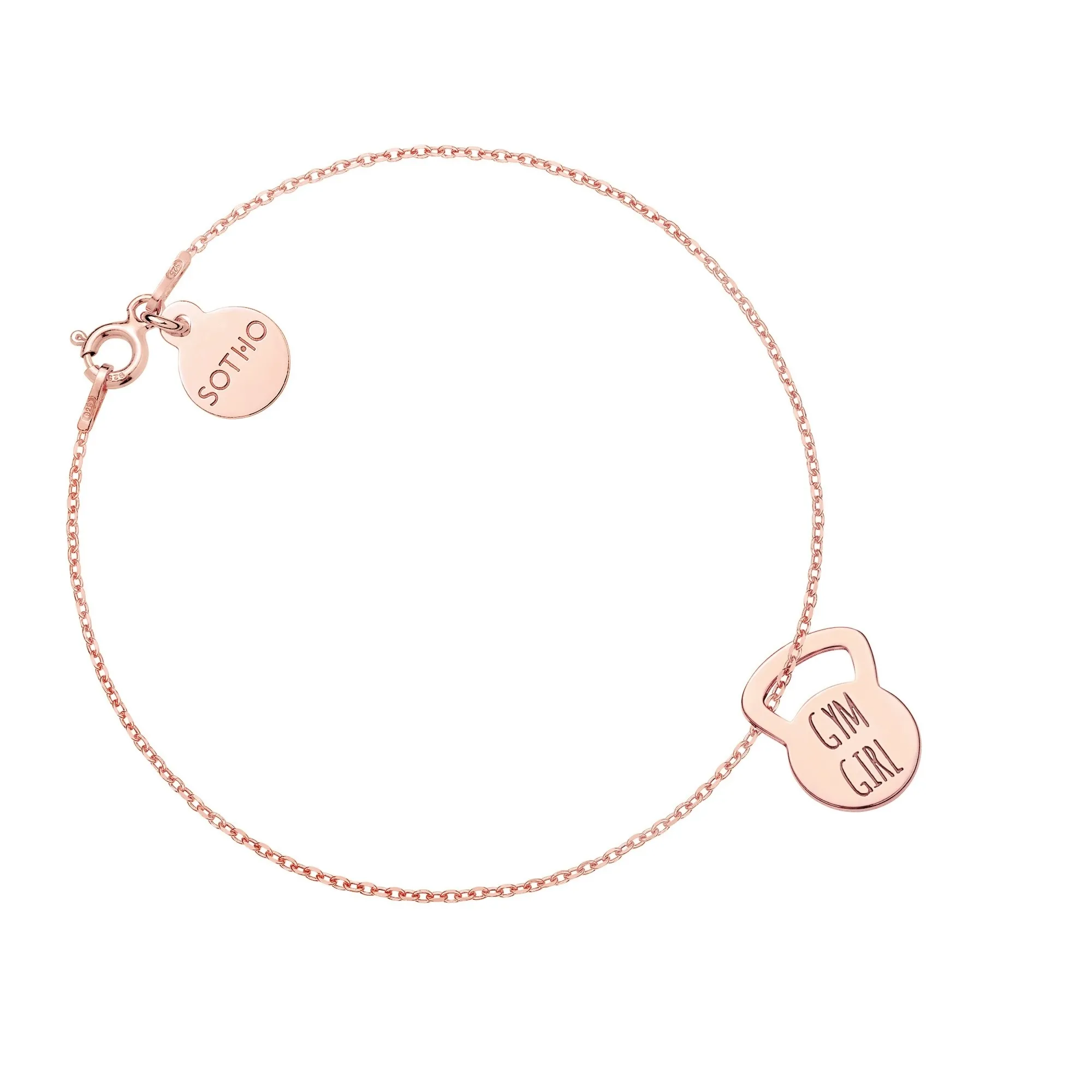 Srebrna bransoletka łańcuszkowa zdobiona ciężarkiem kettlebellem i zawieszką z logo marki. Całość wykonana ze srebra 925. Na ciężarku znajduje się grawerunek z motywującym przesłaniem GYM GIRL.