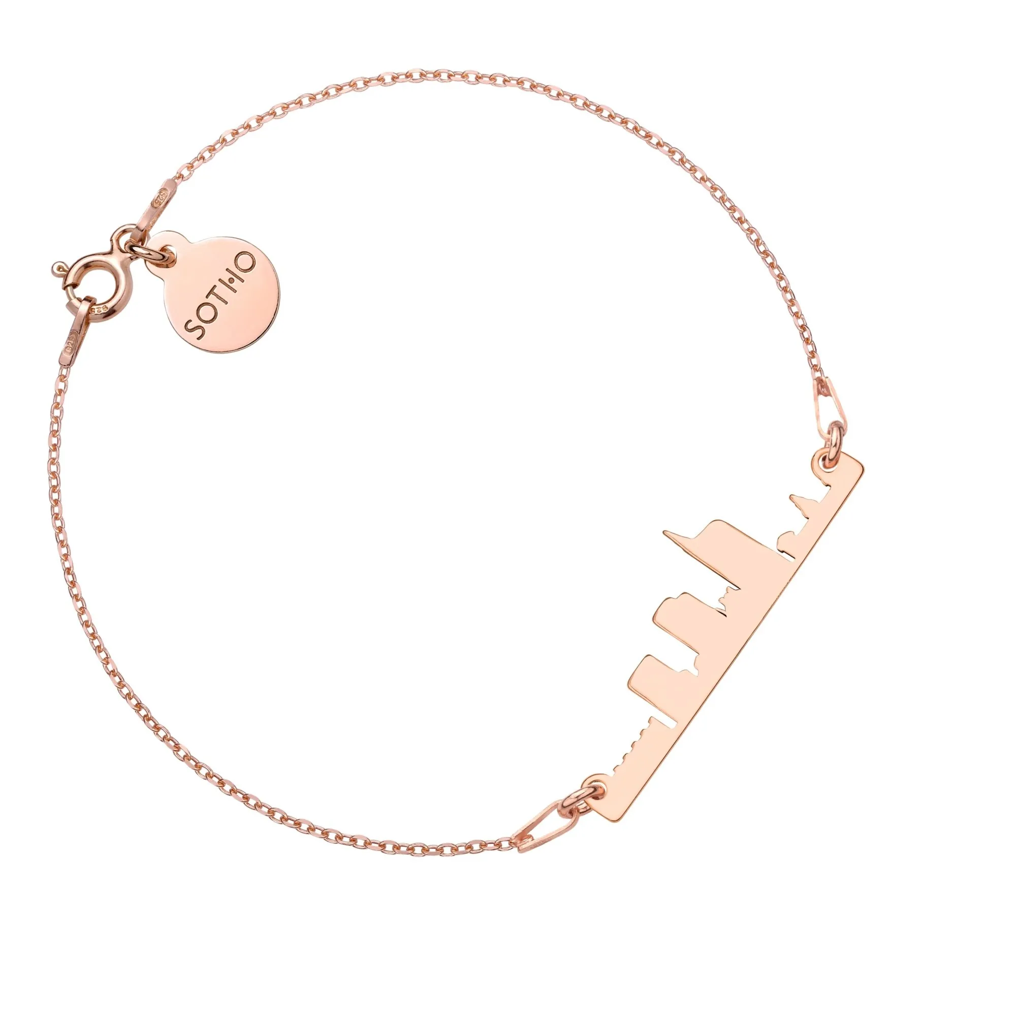 Srebrna bransoletka łańcuszkowa zdobiona zawieszką w kształcie miasta Mediolan i zawieszką z logo marki. Całość wykonana ze srebra 925. Długość ok. 18 cm. Grubość łańcuszka 1 mm. Miasto 31 x 10 mm.. Zawieszka z logo 10 mm. Produkt o wadze poniżej 5 g. Zapakowana w eleganckie pudełeczko z logo marki. Posiada logowaną metkę. Istnieje możliwość zamówienia bransoletki innej długości, z innym modelem zawieszki, z kilkoma zawieszkami, na innym modelu łańcuszka, w wersji ze srebra 925 powlekanego 24 karatowym różowym lub żółtym złotem itp.