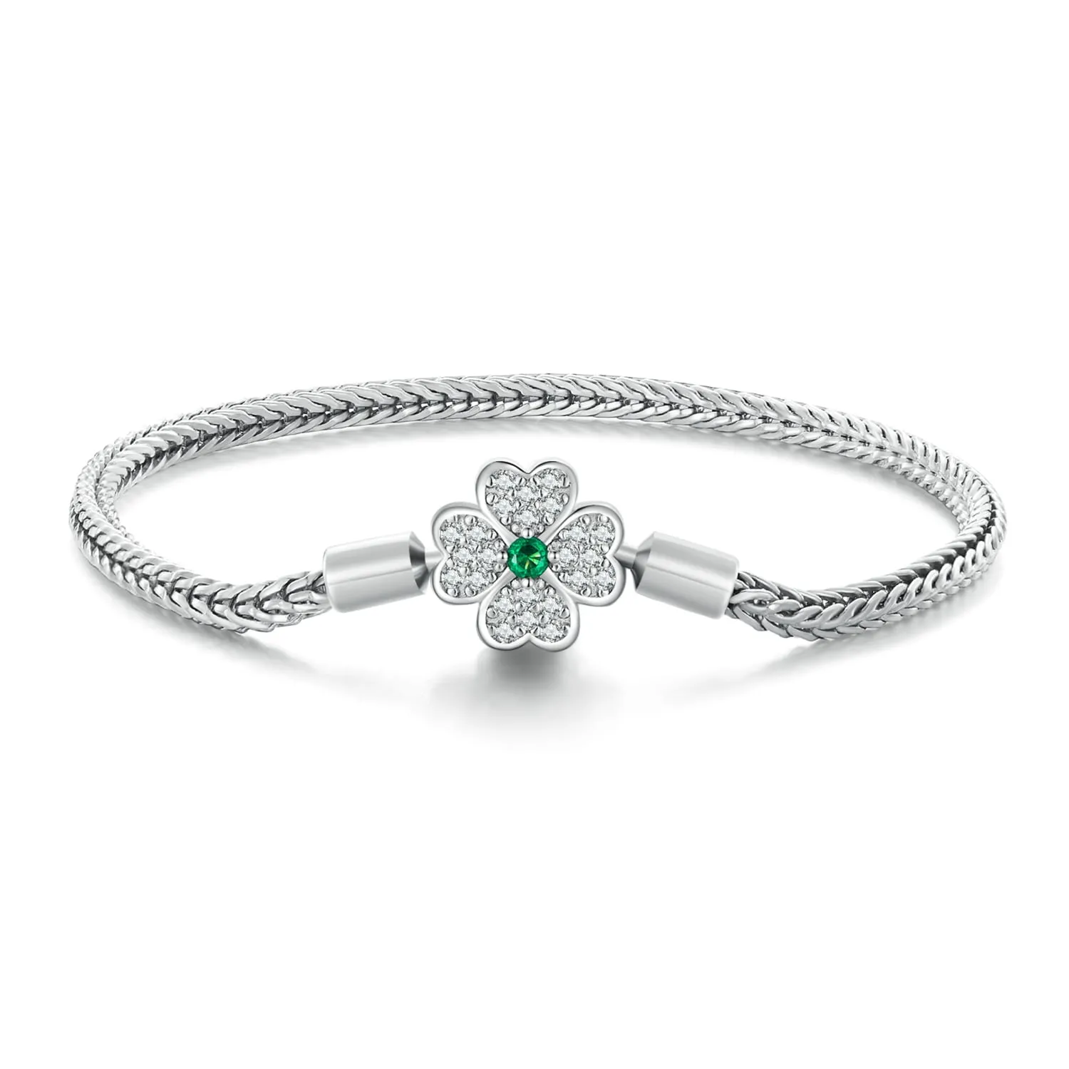 Uniwersalna srebrna bransoletka modułowa charms, rozmiar 17 cm. Bransoletka wykonana jest w całości ze srebra 925 materiał: srebro 925 kolor kryształów: przezroczyste i zielone zapięcie kształt: czterolistna koniczynka splot: kwadratowa żmijka długość: 17,0 cm grubość: 3,0 mm wymiary zapięcia 11,0*11,0 mm waga: 8,60 g marka: SilverBeads model: B1217 Bransoletka pasuje do wszystkich naszych koralików i zawieszek oraz wyrobów innych znanych producentów. Gratis eleganckie opakowanie. Bransoletkę zapakujemy w eleganckie pudełeczko prezentowe. W przypadku zakupu bransoletki wraz z charmsami otrzymasz je razem w jednym pudełeczku. Jeśli kupujesz biżuterię dla kilku osób i potrzebujesz dodatkowych pudełeczek lub woreczków satynowych znajdziesz je w naszej ofercie.