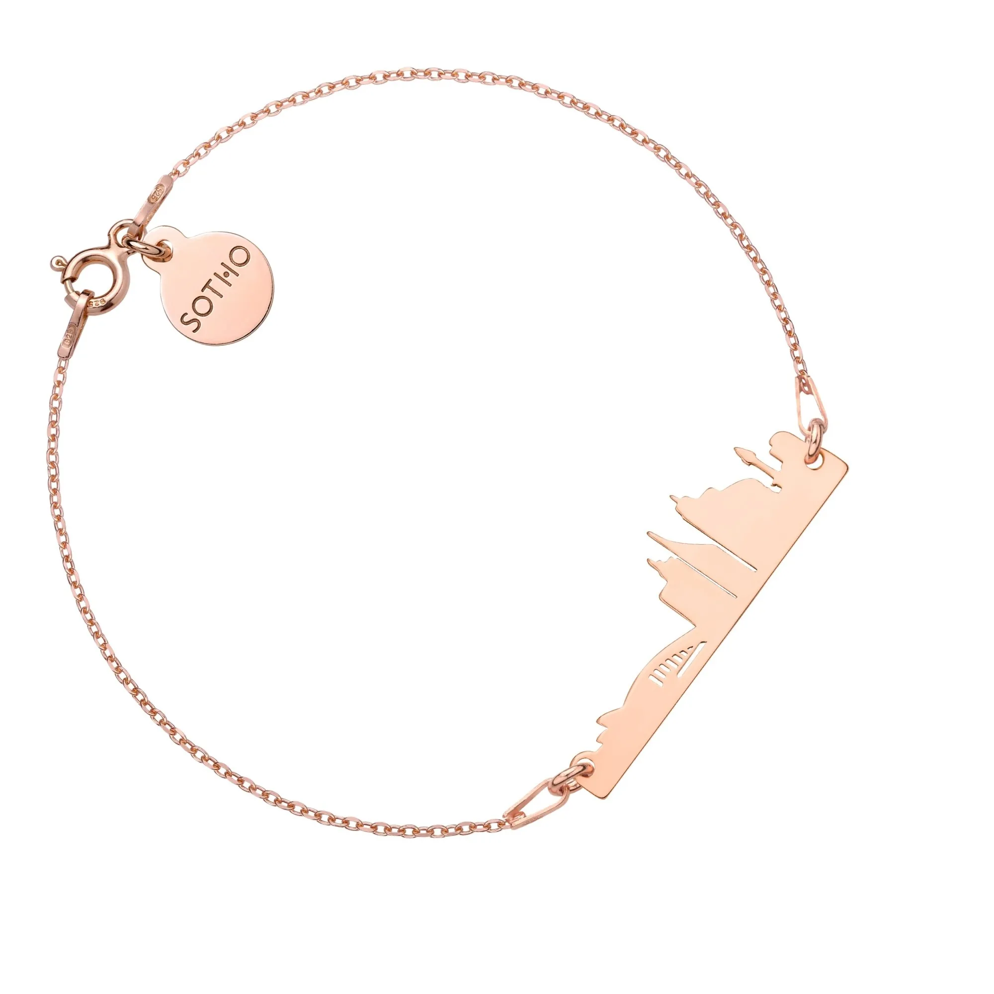 Srebrna bransoletka łańcuszkowa zdobiona zawieszką w kształcie miasta Sydney i zawieszką z logo marki. Całość wykonana ze srebra 925. Długość ok. 18 cm. Grubość łańcuszka 1 mm. Miasto 32 x 10 mm.. Zawieszka z logo 10 mm. Produkt o wadze poniżej 5 g. Zapakowana w eleganckie pudełeczko z logo marki. Posiada logowaną metkę. Istnieje możliwość zamówienia bransoletki innej długości, z innym modelem zawieszki, z kilkoma zawieszkami, na innym modelu łańcuszka, w wersji ze srebra 925 powlekanego 24 karatowym różowym lub żółtym lub żółtym złotem itp.