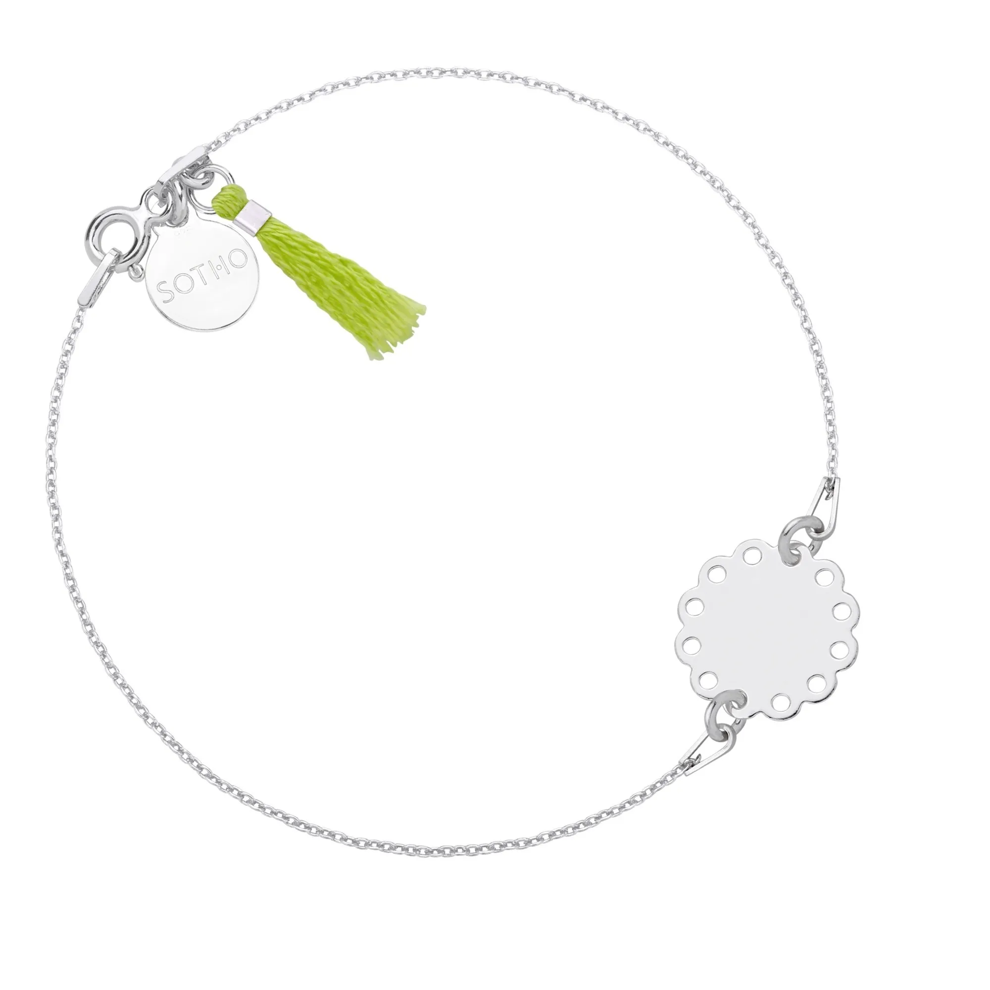 Bransoletka łańcuszkowa zdobiona arabską rozetką, chwostem i zawieszką z logo marki. Całość wykonana ze srebra 925. Długość ok. 17 cm. Grubość łańcuszka 1 mm. Rozetka 15,5 mm. Chwost 2 cm. Zawieszka z logo 10 mm.